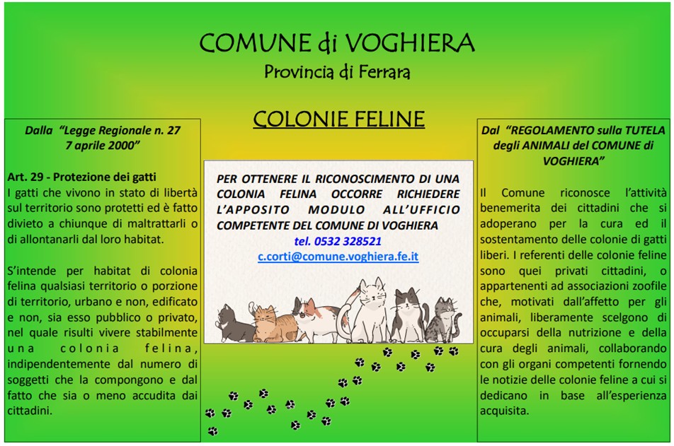 "Una colonia felina esiste quando è istituita dal Comune, indipendentemente dal numero di gatti che la compone, che vivono stabilmente in un determinato territorio urbano e non, edificato e non, sia esso pubblico o privato."
