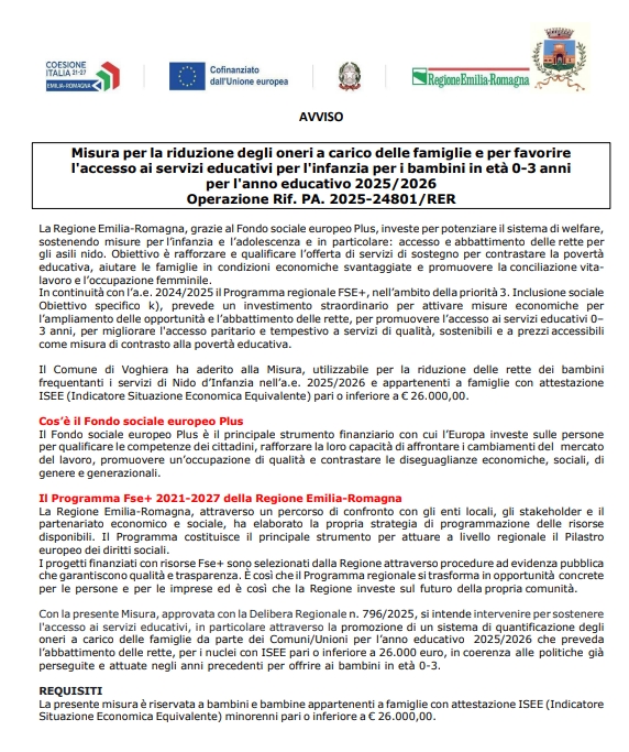 Anche per l'anno educativo 2025/2026 la Regione Emilia Romagna con delibera di Giunta Regionale 796/2025 ha approvato le misure per l'abbattimento delle rette di frequenza all'asilo nido per l'anno educativo 2025/2026 da applicarsi alle famiglie con ISEE fino a 26.000 euro, sostenendo il più ampio accesso ai servizi 0-3.